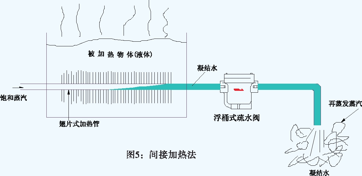 在加熱管(也便是熱交換器)內(nèi)通入蒸汽,被加熱物與這些管道的表面進行接觸是蒸汽放出的潛熱由被加熱物吸收,從而完成加熱。蒸汽放出潛熱后凝結(jié)成凝結(jié)水。這種凝結(jié)水再由蒸汽疏水閥排放到大氣中去(見圖5〉。所謂直接加熱便是只能利用蒸汽的潛熱。如前所述,蒸汽壓力越高,潛熱越少,而飽滿水的顯熱反而添加;也便是說,供給所用的熱交換器必需且適當(dāng)壓力的飽滿蒸汽,是節(jié)能的關(guān)鍵所在。